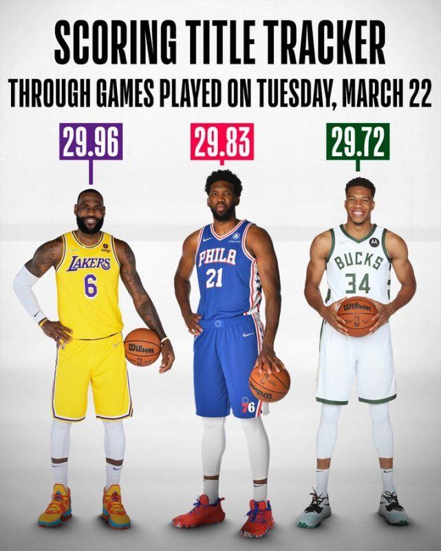 目前,NBA常规赛得分王的竞争已经接近白热化,一场比赛的得分都可能改变前三位的座次。官方也晒出了詹姆斯、恩比德和字母哥的最新得分数据,精确到小数点后两位。詹姆斯场均29.96分,恩比德场均29.83分,字母哥场均29.72分,谁会拿到最终的得分王呢?让我们拭目以待。