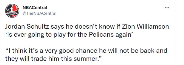 “就大局而言,我不知道锡安是否会再次为鹈鹕效力,他生涯至今只打了85场比赛,如果你今年夏天不交易他,那从长期来看,你能得到什么?如果你不相信他会保持健康,那还有什么好讨论的?”名记Jordan Schultz说道,“我认为他很有可能不会回来,他们将在今年夏天交易他。”