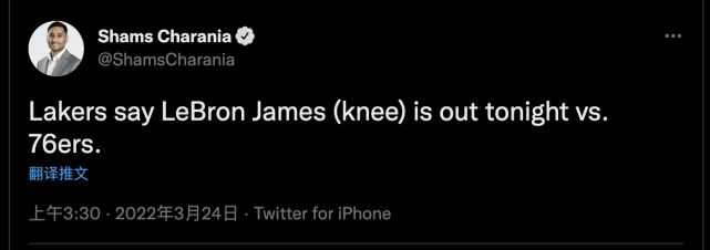 湖人在北京时间3月24日迎来对阵76人的比赛,只是由于膝盖伤病的影响,勒布朗-詹姆斯并不会出战对阵76人的这场比赛: