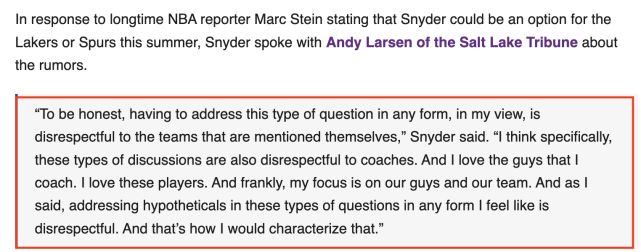 最后需要谈及的是,前些天有消息称湖人已经将爵士主教练奎因-斯奈德视为球队新任主教练的候选人,对此斯奈德也给出回应: