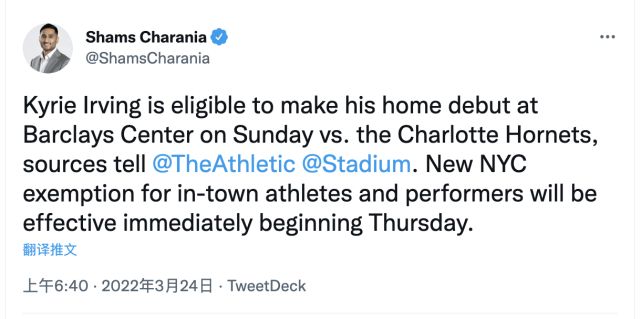 “凯里-欧文将有资格在对阵黄蜂的主场比赛中迎来巴克莱中心的主场首秀,纽约市对市内运动员和演出者的新豁免规则将从本周四开始生效。”