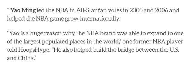 姚明也得到了一些票数,证明了他有被同行认可的影响力。HoopsHype还专门点评了姚明:“姚明在2005年和2006年的全明星球迷投票上排名第一,他帮助NBA在国际舞台上获得成长。他是NBA品牌能够拓展到世界上人口最多国家的重要原因,他是两国之间的桥梁。”