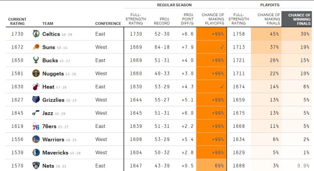 FiveThirtyEight预测本赛季夺冠概率榜:
