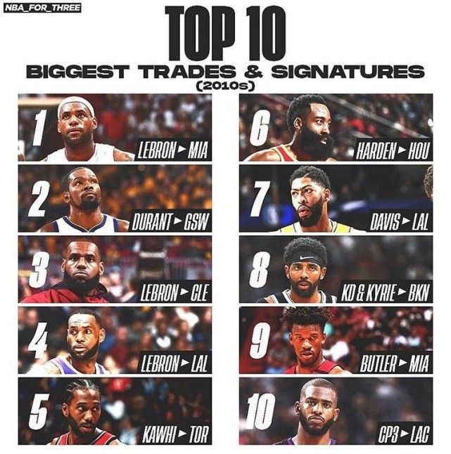 如今的NBA联盟三巨头已经成为了家常便饭,自皮尔斯加内特以及雷阿伦组成三巨头之后,现役球员中还有一些球员的转会直接影响了整个联盟,其中就包括詹姆斯以及杜兰特等巨星,近日,美国媒体就排出了现役球员的十大转会对于整个联盟的影响排名。