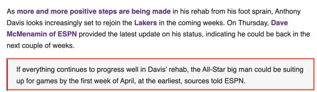 “消息人士告诉ESPN,如果戴维斯的康复一切顺利,那么这位全明星内线最早可能会在4月份第一周之前重返赛场。”
