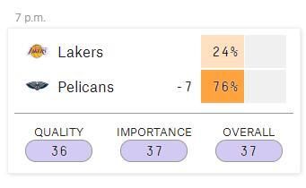 就算詹姆斯有75%的出战概率,但美媒FTE也不看好湖人在客场击败鹈鹕,他们预测湖人击败鹈鹕的概率只有24%,鹈鹕有76%的概率拿下这场关键之战,两队此前有过一次交手鹈鹕大胜,只要这场比赛能拿下,鹈鹕保住西部第九的概率会很大。