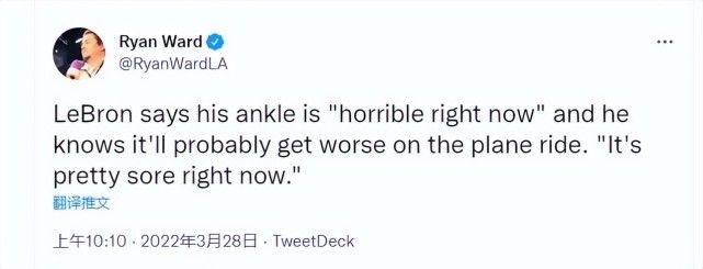 当被询问是否会导致他缺席比赛,詹姆斯说:“我希望不会,狗屎。我讨厌缺席比赛,不是我的风格。”詹皇的脚踝伤势成为了湖人接下来比赛的不确定因素,紫金军团要想守住附加赛席位困难重重。
