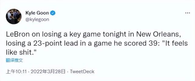 关于这场比赛被逆转,詹姆斯非常不甘心,他表示:“这感觉就像屎一样。”