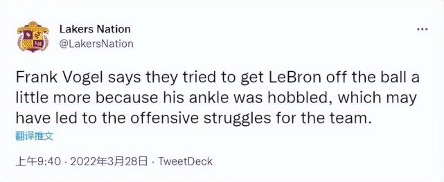 “因为詹姆斯脚踝受伤后有些蹒跚,所以我让他多打一些无球,这可能导致球队的进攻陷入了挣扎。”沃格尔说道。