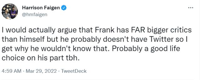 沃格尔的这番话很快引起热议。转发这一内容的跟队名记哈里森-费根写道:“我可能有不同的意见。沃格尔最大的批评者,要比他自己大的多。他可能没有社媒,所以我明白他不知道这一点的原因。对他来说,这可能是一个不错的生活选择。”