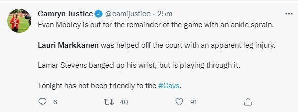 根据骑士队记者克里斯-费尔德的报道,马尔卡宁在尝试了膝盖的感受后重回替补席,在末节还继续登场,最终打了30分钟,拿下20分3篮板帮助骑士队取胜。