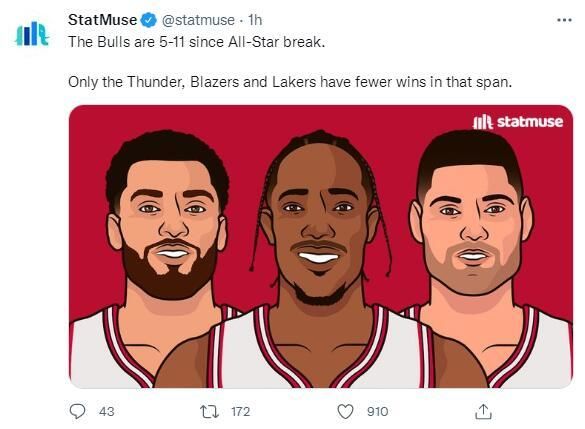 全明星周末后,公牛队只取得了5胜11负的战绩,同期仅比雷霆、湖人优异,要知道公牛本赛季初中段一度是东部前三的超级强队,在拉文、鲍尔、卡鲁索都受伤的情况下阿赞一人扛起球队,可进入末段阿赞的统治力明显下滑了。