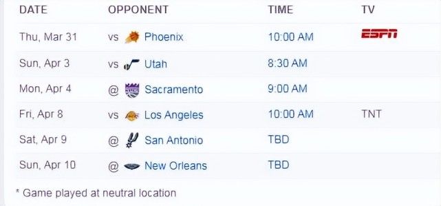 勇士第三个坏消息是独行侠追上来了。独行侠最近10场比赛6胜4负,状态并不算很好。但是勇士最近10战4胜6负。独行侠46胜29负只落后勇士1.5个胜场。勇士的赛程很不利,剩余6个对手是太阳、爵士、国王、湖人、马刺和鹈鹕。值得一提的是,最后3个对手在争抢附加赛席位,碰上勇士肯定会玩命。勇士的战绩排名有可能落到西部第四。