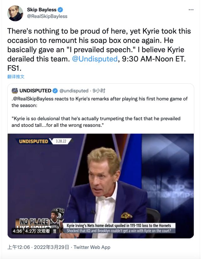只不过并不是每个人都看到能重新出战主场比赛的欧文,著名詹黑斯基普-贝勒斯就不那么看好这支在欧文率领下的篮网: