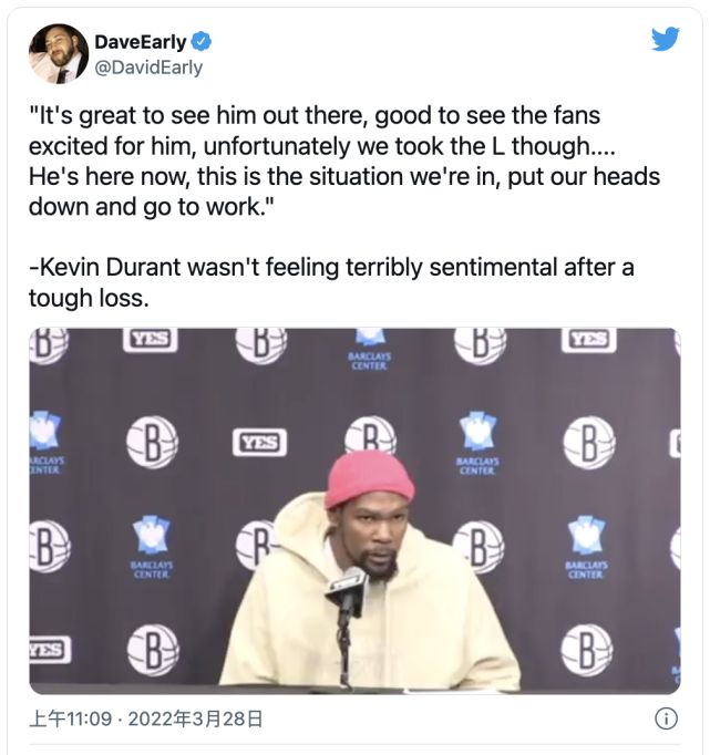 “我很高兴能看到他在场,很高兴看到球迷们为他兴奋,但不幸的是我们输掉比赛”杜兰特说道,“但我们知道他在这里,我们会继续前进,在我们所拥有的基础上再接再厉,争取下一场比赛中获胜。”