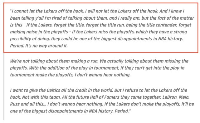 “如果湖人没能闯入季后赛,那将是联盟历史上最大的失望之一。”