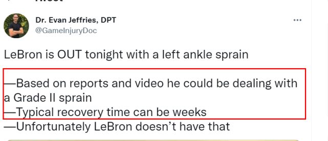 医学专家Evan Jeffries表示,基于报道和视频,詹姆斯可能遭遇了二级扭伤。根据此前Evan的描述,一级扭伤要7-10天康复,二级扭伤要3-4周,三级扭伤要几个月。如果是二级扭伤,詹姆斯要缺席数周的时间,有可能赛季报销。至于戴维斯,湖人方面也保持谨慎的态度,他们不希望让浓眉冒着再次受伤的风险。此前有记者解析,如今的赛程让湖人很难有训练的时间,浓眉没有机会通过几次高强度训练后再复出。