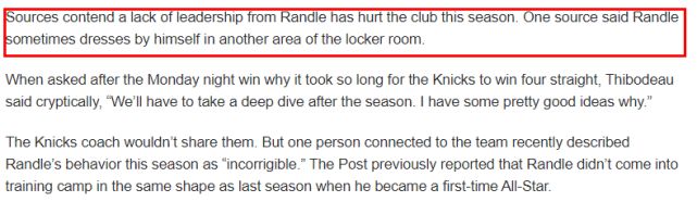消息人士称,兰德尔缺乏领导力已经伤害了本赛季的尼克斯。一位与球队相关的人士表示,兰德尔本赛季的行为是“不可救药的”。此前有报道称,兰德尔进入训练营的状态,就与上赛季首次入选全明星时很不同。本赛季他还和裁判、球员发生多次争执,多次被NBA罚款。美媒称兰德尔产生了嫉妒的心理,因为即便兰德尔打得比队友巴雷特更出色,球馆里的球迷高呼的也是巴雷特的名字。