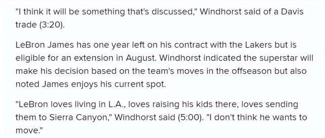 詹姆斯的合同将在2023年到期,他有资格在今年夏天提前续约。温德霍斯特表示,这位超级巨星将根据球队在休赛期的动向做出决定,但他也指出詹姆斯很享受目前的位置。