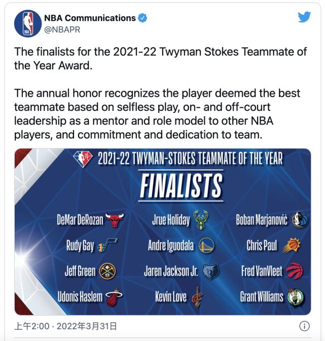 另一方面,联盟宣布勇士老将安德烈-伊戈达拉入围年度最佳队友奖项的最终候选人: