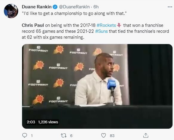 赛后保罗谈到:我想要赢得一个总冠军,但就算没有总冠军也不会影响我们达成一些成就。我们62胜已经追平太阳队史最佳战绩,我们还有6场比赛,17-18赛季时我曾在火箭拿下过65胜,我们有机会去完成这些成就。