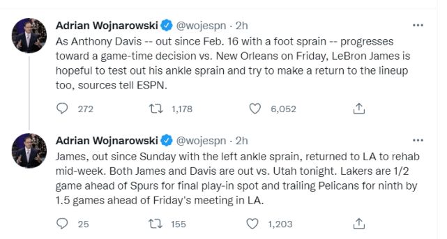 北京时间4月1日,据名记沃纳罗斯基报道,湖人球星詹姆斯和戴维斯均计划在本周六对鹈鹕的比赛中复出。詹姆斯将在赛前测试脚踝,希望能重返球场,而戴维斯也把这一天当成复出的目标时间。随后,名记查拉尼亚报道称,戴维斯只要伤情没有反复,就将在对鹈鹕的比赛中出战,两人均确定缺席今天对爵士的比赛。