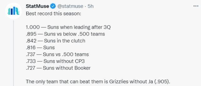 在这三支球队里,太阳最是了得。StatMuse列出了太阳赛季至今的一些成就。他们本赛季对阵16支球队是100%的胜率,对余下的13支球队也是至少五成的胜率。本赛季至今的最佳胜率——