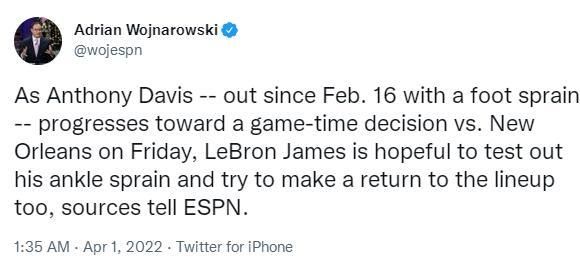 北京时间4月1日,ESPN记者沃神报道,勒布朗-詹姆斯将接受脚踝扭伤的伤势评估,有望尝试在对阵鹈鹕的比赛中复出。此外,安东尼-戴维斯已经确定将在对阵鹈鹕的比赛中复出,他在二月因为脚部扭伤缺席至今,他前天已经完成过5V5的对抗性训练。