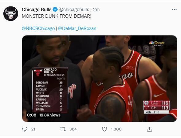 德罗赞这场比赛的表现十分炸裂,在末节还剩3秒德罗赞手握三次罚球的机会,只可惜他三罚两中刚好扳平118-118两队进入加时赛,但在这三个罚球之前德罗赞已经拿下15分,末节德罗赞拿下了15分全队36分,末节在德罗赞的带领下公牛打出36-26的高潮。
