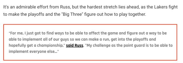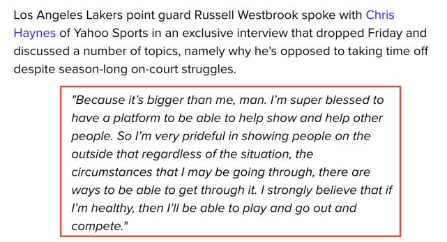 湖人核心控卫拉塞尔-威斯布鲁克在北京时间4月2日接受雅虎体育记者克里斯-海恩斯的独家采访,在这次采访中,威斯布鲁克回应了一些备受争议的话题,也就是他在加盟湖人后所面临的争议和质疑: