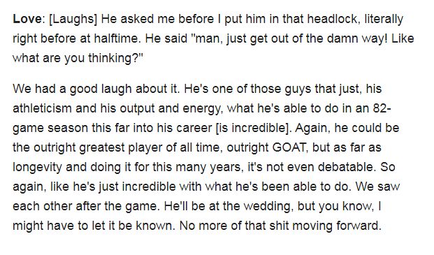 对此,乐福在赛后曾经调侃,不会邀请詹姆斯去他的婚礼,但无疑那是开玩笑的表态。