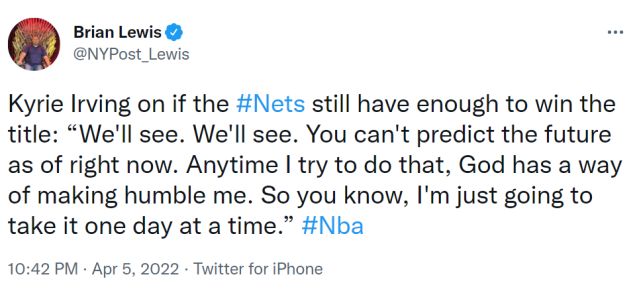当被问及健康的篮网能否拿下一个总冠军时,欧文给出了一个并不确定的答案。“让我们拭目以待,兄弟。”欧文说道,“我们身处现在,无法预知未来。任何时候当我试图探问未来,上帝都会以他的方式使我敬畏,让我谦卑。所以你知道,我就是过好当下的每一天。我只能走一步看一步,这是我一整个赛季一直强调的。打一场看一场,我不会去想如果我们赢了全部4场,如果我们3胜1负……那么我们的对手会是谁。我只是期待今天的比赛,希望我们能有一场精彩的表演。”