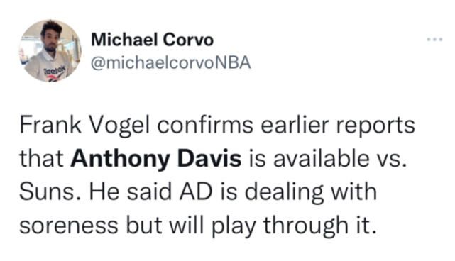 比赛之前沃格尔表示安东尼-戴维斯会登场,过去的两天戴维斯都在处理自己的脚伤。伤病报告显示戴维斯的足中部酸痛,为了博附加赛名额戴维斯拼了,坏消息是马刺击败了掘金,湖人只要输球就无缘季后赛。
