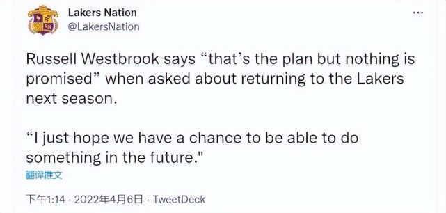 除了沃格尔的去留外,威少的去留也是外界关注的一个热点。当被问到下赛季是否希望回归湖人与詹姆斯和戴维斯合作。威少表示:“那是需要计划的,但现在没有什么可承诺的。我只是希望我们有机会在未来做点什么。”
