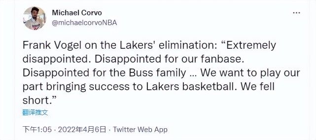 “非常沮丧,我想对我们的球迷,还有对巴斯家族说,我们感到非常失望与沮丧。我们希望能够发挥自身的作用,为湖人篮球带来成功,但我们失败了。”沃格尔承认了失败。