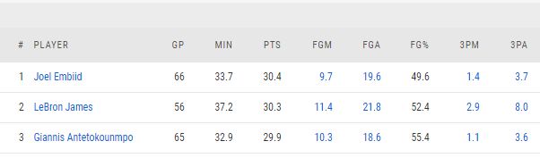 恩比德在上一场比赛狂轰44分,已经将他的场均得分提升到30.20分,距离詹姆斯只有0.07分的微弱差距。如今在詹姆斯因伤缺席与太阳的比赛,且詹姆斯需要接下来的比赛至少出战2场,才能达到至少58场的参赛场次要求情况下,无疑恩比德成为得分王的最有力争夺者。