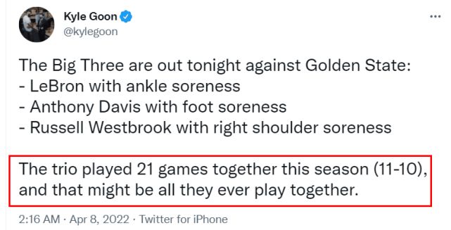 湖人记者Kyle Goon跟进报道称,湖人三巨头本赛季仅合体出战21场比赛,战绩是11胜10负。Goon表示,这可能也是他们能在一起打的所有比赛了。显然,他不看好湖人三巨头下赛季能继续合作了。