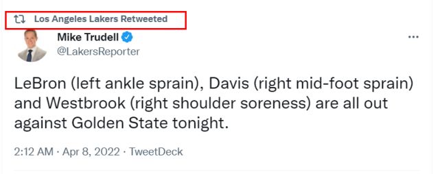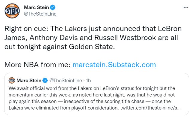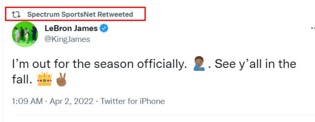 洛城媒体Specrum SportsNet转发了詹姆斯愚人节的那条推特,推特内容是“我的赛季已经正式结束,让我们秋天再见。”洛媒重提詹姆斯那时的玩笑话,只因现在已然成为事实。詹姆斯当地时间愚人节出战鹈鹕并输掉比赛,随后没有再上过场。