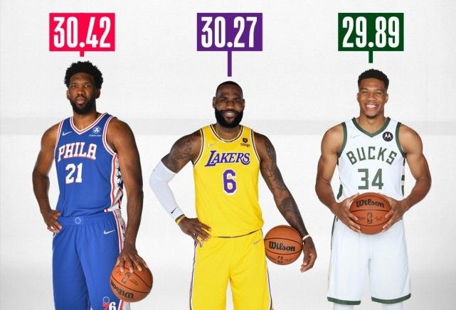 赛季至今,詹姆斯总计出战56场比赛,场均上场37.2分钟,贡献30.3分8.2篮板6.2助攻,投篮命中率52.4%,三分命中率35.9%。目前,他的场均得分排在第二,仅次于恩比德,落后0.15分。