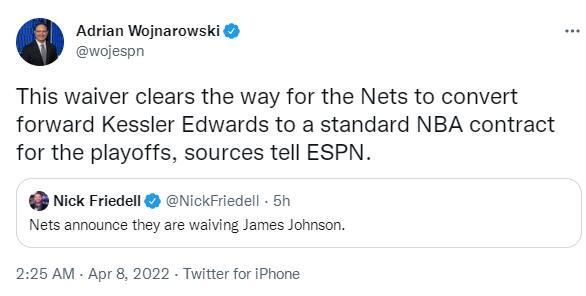 随后沃神曝出篮网裁掉詹姆斯-约翰逊是为了将双向合同球员凯斯勒-爱德华兹的合同转为正式合同,因为只有正式合同球员才能打季后赛。爱德华兹已经进入了篮网的常规轮换,本赛季场均20.2分钟,拿下5.8分3.5篮板0.7抢断0.63盖帽,他是篮网锋线一个重要轮换。