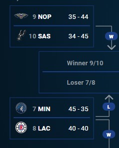 在掘金锁定季后赛后,西部的附加赛对阵表确定,马刺与鹈鹕交战,胜者面对森林狼与快船之间的败者,而森林狼与快船之间的胜者将直接进入季后赛,而西部的第一二名也已经确认,第七名将面对灰熊,第八面对太阳,最终会是哪两支球队突围附加赛呢?