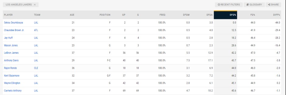 可以看到的是,排除掉出场次数5场都没的几位球员,詹姆斯是整支湖人队限制对手投篮第二的球员。