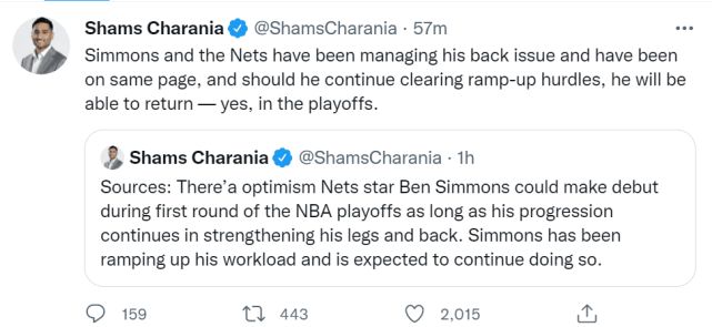 ESPN名记沃纳罗斯基跟进报道称,西蒙斯的背部已无疼痛感,这点燃了他在东部季后赛首轮回归的希望,就算他刚复出时只能打10-15分钟。