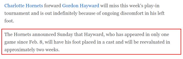 海沃德在2月8日扭伤脚踝,并连续缺席22场比赛。这位昔日的全明星在4月3日对费城的比赛中复出,打了17分钟,但随后他又再次缺席,已经连续四场休战。