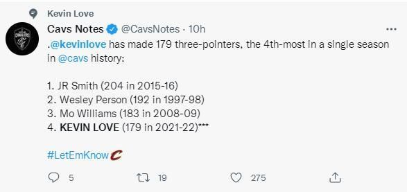 此役前乐福命中179个三分球,此役后他命中187个三分球,他成为骑士队史单赛季命中三分球第三多的球员,也是单赛季命中三分球最多的内线球员。
