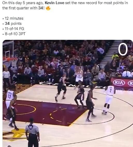 乐福单节34分被重提,15分钟拿下32分对于乐福来说并不稀奇,乐福曾在2016年完成过单节34分,12分钟,14中11,三分10中8拿下34分,若欧文最后两次进攻再给乐福,或许他就打破克莱单节37分的纪录了。