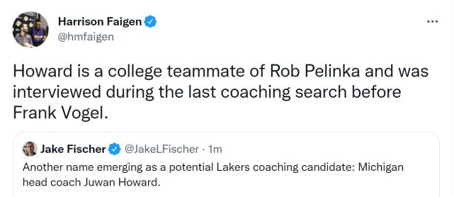 北京时间4月11日,据NBA记者Jake Fischer报道,密歇根大学的主教练朱旺-霍华德成为了湖人新主帅的潜在目标之一,湖人记者Harrison Faigen跟进报道称,霍华德是湖人总经理佩林卡的大学队友,他曾经参加上一次的湖人选帅,并在沃格尔之前接受球队的面试。