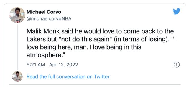 而据美媒透露,蒙克还是想要重返这支湖人:“马利克-蒙克说自己很想回到湖人:我喜欢待在这里,伙计,我喜欢置身于这种氛围中。”