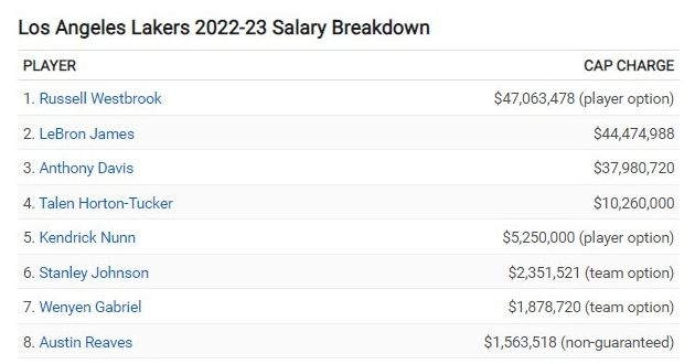 湖人休赛期阵容名单还有8名球员有合同,分别是威少4710万球员选项;詹姆斯4447万;浓眉哥3798万;塔克1026万;纳恩525万球员选项;约翰逊235万球队选项;加布里埃尔188万球队选项;里夫斯156万保障性薪资。如此8人已经达到1.45亿美元,而下赛季奢侈税线约为1.47亿美元,湖人基本没有太大薪金空间进行操作。