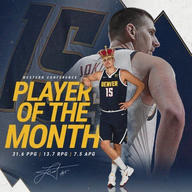 约基奇在3-4月场均贡献31.6分13.7篮板7.5助攻1.8抢断1.3盖帽,投篮命中率62.3%,他帮助掘金连续第四年晋级季后赛。这是约基奇生涯第4次当选月最佳球员,他超过了安东尼和英格里什,成为掘金队史获得月最佳荣誉最多的球员。掘金官方晒图祝贺约基奇当选。